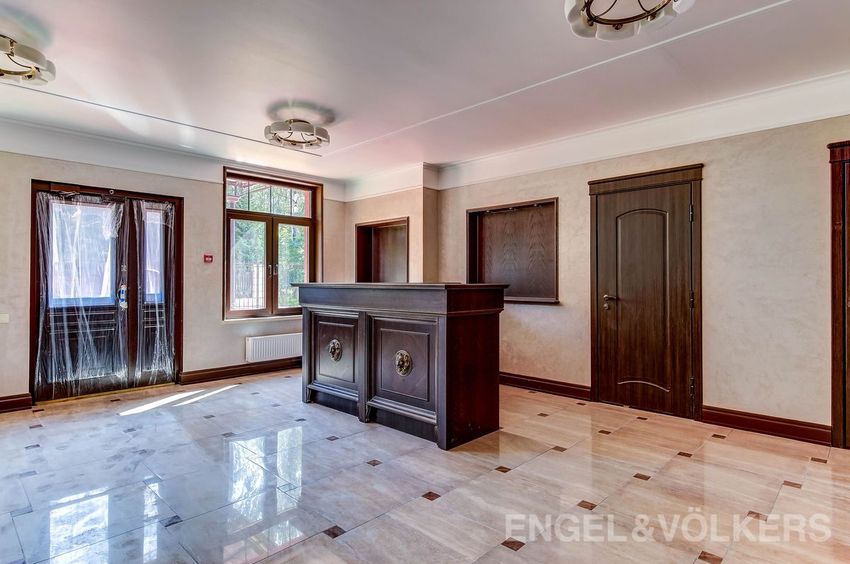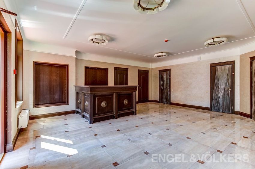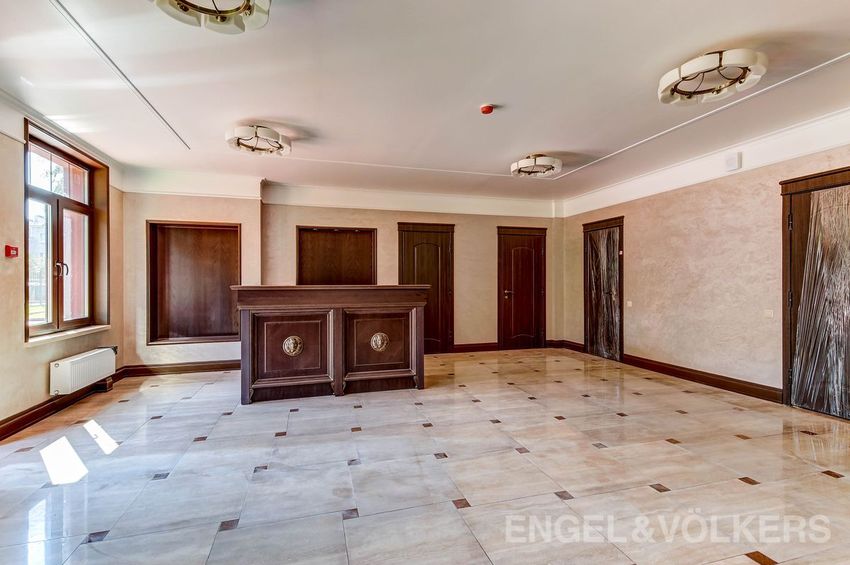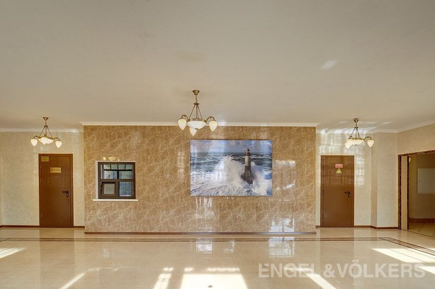 Закончены работы по оформлению интерьера входной группы и холла первого этажа. Отделка выполнена с применением натуральных материалов: керамогранит, дерево и дополнена дорогой кожаной мебелью, картинами с видами на панораму города и декоративной подсветкой.